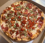 Roasted peppers, sausage, pepperoni, basil, mozzarella.